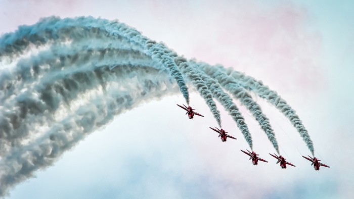 I try to look at aircraft photography as an art form where all the usual photographic elements apply: good composition, effective lead-lines (from clouds, vapour or smoke trails), space for the aircraft to move into, unusual orientations, exciting routines, dramatic skies and cloud patterns. Getting all those elements in place with good technical quality makes it a challenge.